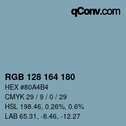 Die Aufschlüsselung der Farbe in das RGB-Farbsystem: In diesem Farbton sind von 255 maximalen Farbanteilen jeweils 128 Rot, 164 Grün und 180 Blau.