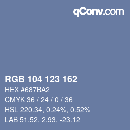 La descomposición del color en el sistema de color RGB: en este tono de color estan, de entre máximo 255 componentes de colores, respectivamente 104 el rojo, 123 el verde y 162 el azul.