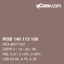 Los siguientes colores más cálidos coinciden con el color RGB 140 113 108: RGB 141 114 109 y RGB 141 109 109