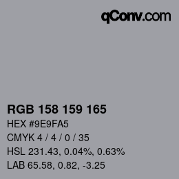 Los siguientes tonos de color más claros coinciden con el color RGB 158 159 165: RGB 163 159 160, RGB 180 177 179, RGB 197 195 198, RGB 214 213 217 y RGB 231 231 236