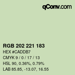 La descomposición del color en el sistema de color RGB: en este tono de color estan, de entre máximo 255 componentes de colores, respectivamente 202 el rojo, 221 el verde y 183 el azul.