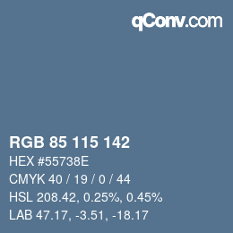 Los siguientes tonos de color más claros coinciden con el color RGB 85 115 142: RGB 90 115 137, RGB 107 133 156, RGB 124 151 175, RGB 141 169 194 y RGB 158 187 213