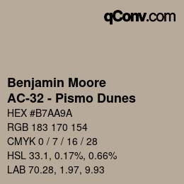 Les teintes monochromes suivantes sont assorties à la teinte Benjamin Moore - AC-32 - Pismo Dunes : Benjamin Moore - CSP-1045 - Wet Clay, Benjamin Moore - ES-51 - Beige Gray, Benjamin Moore - 997 - Baja Dunes, Benjamin Moore - 996 - Ashen Tan et Benjamin Moore - 1003 - Kitten Whiskers