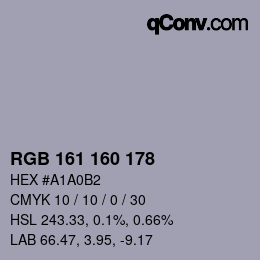 Les teintes plus froides suivantes s'accordent avec la teinte RGB 161 160 178 : RGB 161 160 177 et RGB 160 160 177