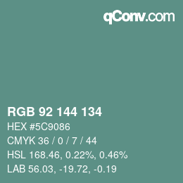 La décomposition de la couleur dans le système de couleurs RGB : dans cette teinte, sur 255 parts de couleurs maximales, respectivement 92 Rouge, 144 Vert et 134 bleu.